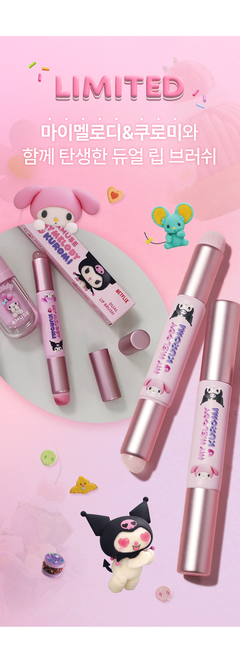 Bring sweetness and style to your makeup routine with the Amuse Dual Lip Brush [My Melody & Kuromi Limited Edition].