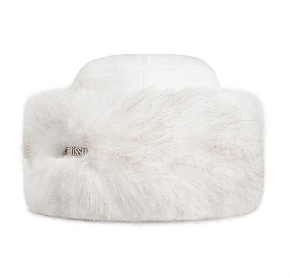 Flat-top bucket hat in suede-textured fabric, featuring soft faux fur details for a plush, cozy silhouette