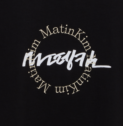 A cropped women's short-sleeved T-shirt featuring a mix of Matin Kim's English circle logo and calligraphy artist Kang Byeong-in's new logo.